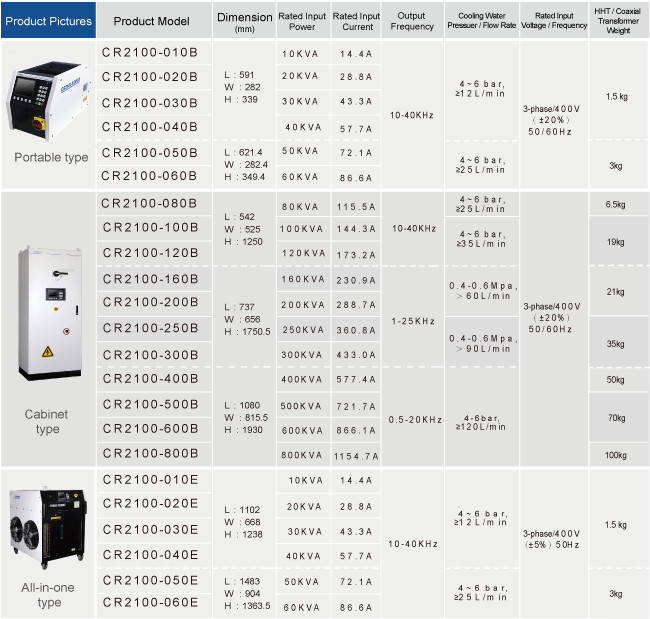সিআর 2100 সিরিজ ইন্ডাকশন হিটিং হ'ল ত্রুটি সুরক্ষা সহ একটি নির্ভরযোগ্য এবং দক্ষ ধাতব তাপ চিকিত্সা ডিভাইস। এটি বিভিন্ন গরম করার প্রয়োজনের জন্য কাস্টমাইজড ইন্ডাকশন কয়েল আকার সরবরাহ করার জন্য ডিজাইন করা হয়েছে।এটি ইন্ডাকশন গরম করার নীতিতে কাজ করে।, যার ইন্ডাকশন কয়েল তামা থেকে তৈরি, এবং এটি 3-ফেজ / 400V ((± 20%) ভোল্টেজ প্রয়োজন।এটি -20 °C ~ +50 °C থেকে সঠিক তাপমাত্রা নিয়ন্ত্রণ সরবরাহ করতে সক্ষম এবং সহজ অপারেশনের জন্য একটি হিউম্যান-মেশিন ইন্টারফেস (এইচএমআই) দিয়ে সজ্জিত হতে পারে. এটি বিভিন্ন শিল্পে ধাতু তাপ চিকিত্সার জন্য দ্রুত এবং নিরাপদ গরম সমাধান সরবরাহ করার জন্য ডিজাইন করা হয়েছে। এটি একটি নির্ভরযোগ্য ডিভাইস যা উচ্চ নির্ভুলতা এবং ত্রুটিগুলির বিরুদ্ধে দুর্দান্ত সুরক্ষা সরবরাহ করে.